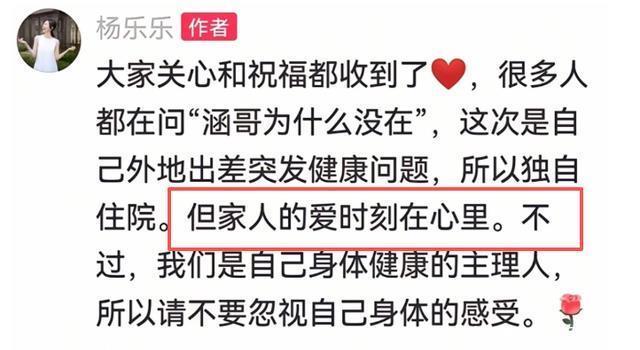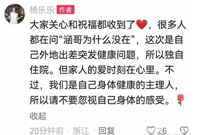 就像这次住院,杨乐乐在外地拍短视频,突然肚子疼得直不起腰,最后跪在地上被路人送到医院。检查结果出来,医生说腹部长了个脓包,耽误太久了,得住院手术。 杨乐乐没告诉工作人员,自己坐在轮椅上做检查,输液的时候一个人看着天花板发呆。 有人问她“为什么不叫汪涵过来”,她笑着说“他在外地录节目,赶不过来,而且我不想让他担心”。 后来汪涵知道了,立马找了当地的朋友去医院照顾她,还每天打视频电话问情况,这些细节她没跟外人说,直到有人质疑汪涵“不关心老婆”,她才特意发了条长文解释: “家人的爱,不是挂在嘴边的,是放在心里的。”